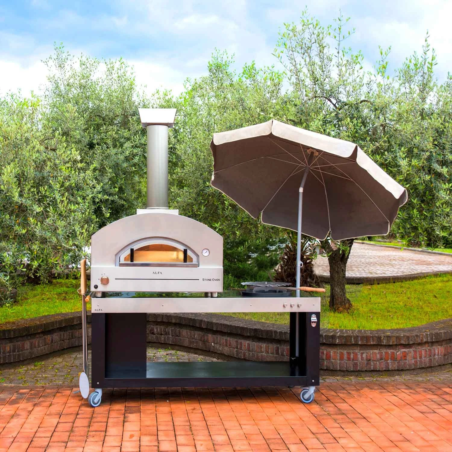 Alfa ACTAVO-130 51-Inch Stainless Steel Base & Prep Station Cart provides a useful base accessory for your perfect outdoor kitchen. The multifunctional stainless steel base offers more room for food prep, cooking and serving. The 51-inch, 4-wheel cart is designed to increase productivity while enhancing the aesthetics of your favorite outdoor space and features a peel holder, bottle opener, (3) stainless steel tool hooks, aluminum cart handle, and (2) wheel brakes. Give your pizza oven the cooking station it needs with help from Alfa.