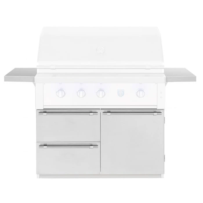 American Made Grills CART-EST42 Freestanding Cart for 42-Inch Estate Grills provides the necessary grill base for your 42-inch Estate gas grill. The stainless steel cabinet features heavy duty locking casters, two collapsible side shelves and a double drawer/single door combo that’s complete with an integrated condiment tray. The LP tank can be stored directly within the cabinet along with any other grilling accessories you need to store outdoors. Enhance the look of your patio or deck with this premier stainless steel grill base; designed with utility and longevity in mind, this cart will help make the most of your grilling outdoor space for many years to come.