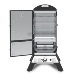 Broil King 955050 Regal Offset 400 Charcoal Smoker, 25.5-Inches offers a traditional southern-style barrel smoker for your outdoor kitchen. Featuring durable 2mm/14-gauge steel construction, this smoker offers exemplary durability and heat retention. Heavy-duty cast iron cooking grids offer a premium cooking surface, while cast aluminum Roto-Draft dampers offer impressive heat control. A durable steel cooking chamber offers supreme cooking capabilities, while dual-purpose smoke diffusing charcoal trays add to the flavor of your food. Removable front and bottom shelves offer added storage space and convenience, while removable stainless steel ash trays make cleanup simple. Two large eight-inch crack-proof wheels offer easy movement, while four durable steel legs with two leg levelers ensure stability.