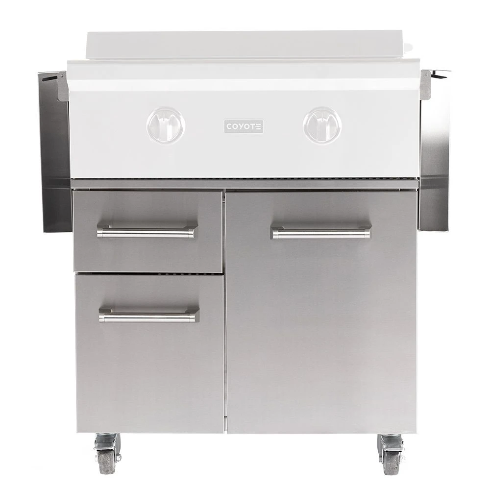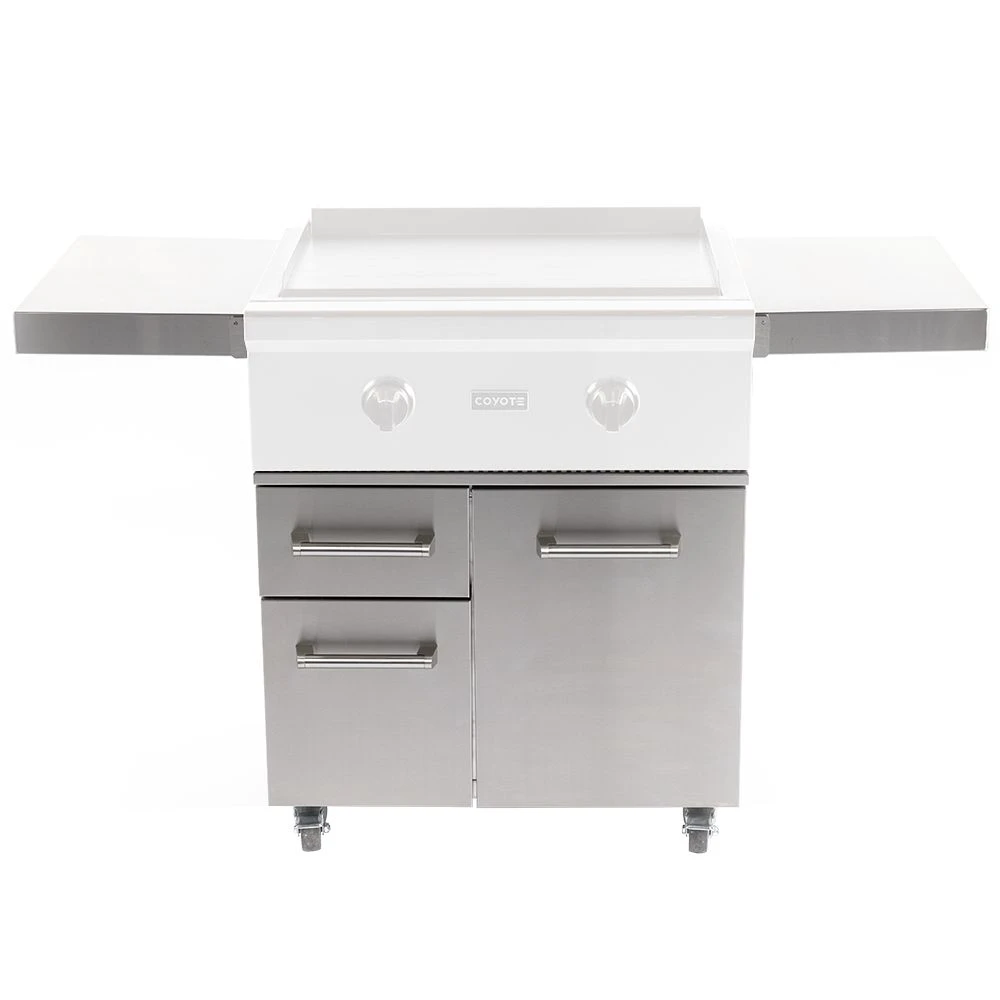 Coyote Stainless Steel Flat Top Griddle Cart, 30-Inch (C1FTCART) provides a premium grill cart to match a Coyote flat top griddle head. This cart features a pair of drawers that provide storage space for all your tools and accessories. Fold down side shelves offer space when you need it and extra room when you don’t, while industrial-quality locking casters offer easy movement. The largest drawer offers the perfect space for propane tank storage (if applicable), and the entire cart comes fully assembled for easy installation.