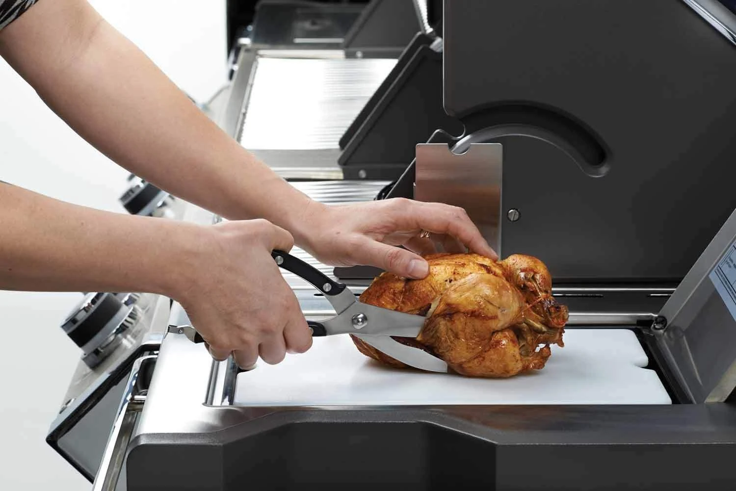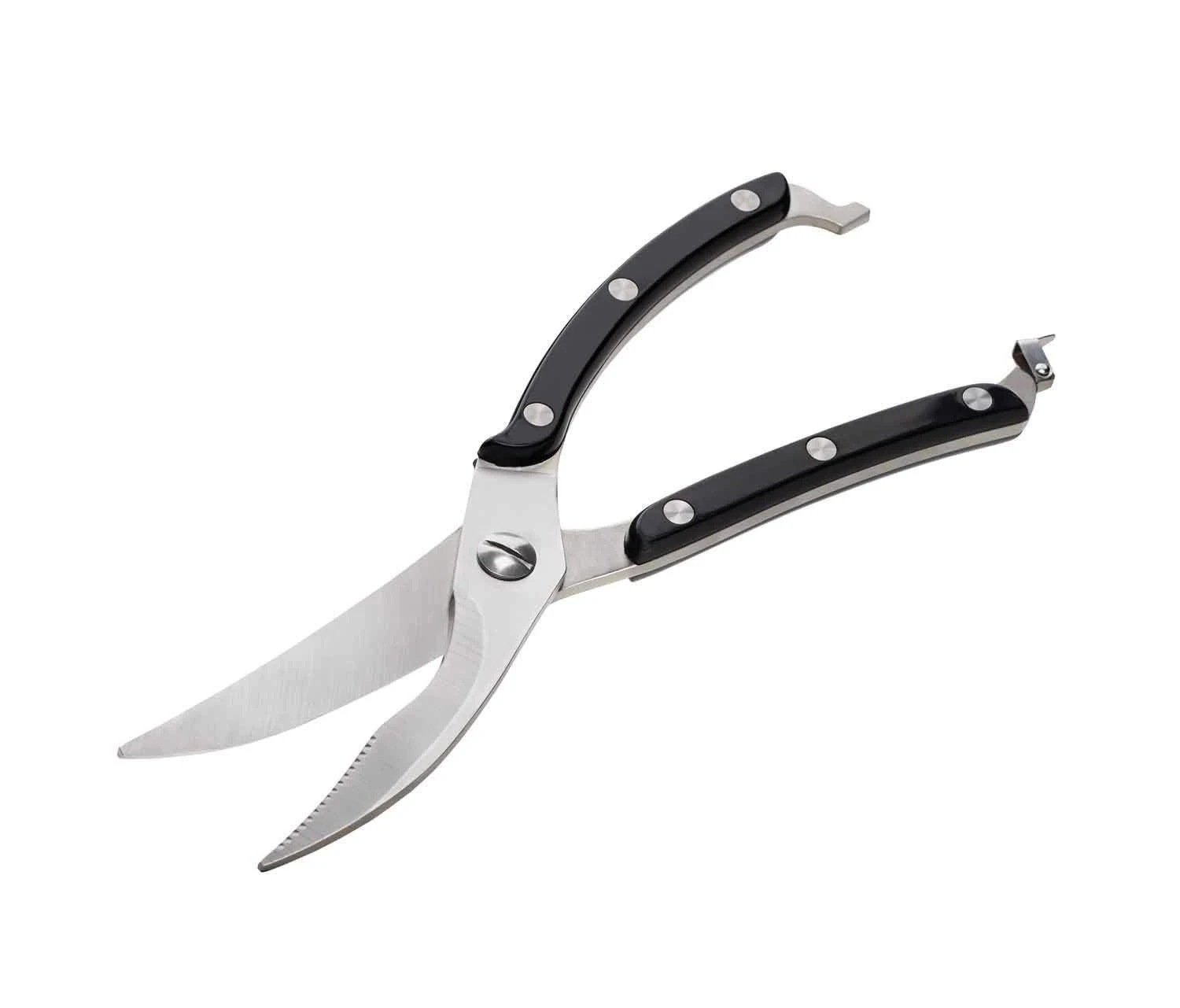 Napoleon 55077 PRO Poultry Shears provides a high quality set of kitchen shears to help with your BBQ prep. The heavy duty stainless steel tang and blades ensure these shears will maintain long lasting durability and will stay sharp even after they cut through meats, shells, or bones. The shears feature a spring tension for improved control and assist to cut through joints while the unique design makes them perfect for left-handed or right-handed use. A safety latch located on the handles keeps the blades locked and closed when not in use and while they’re dishwasher safe, it’s recommended you hand wash them for long lasting durability.